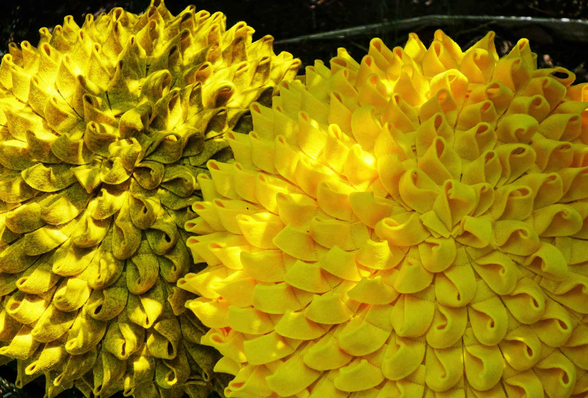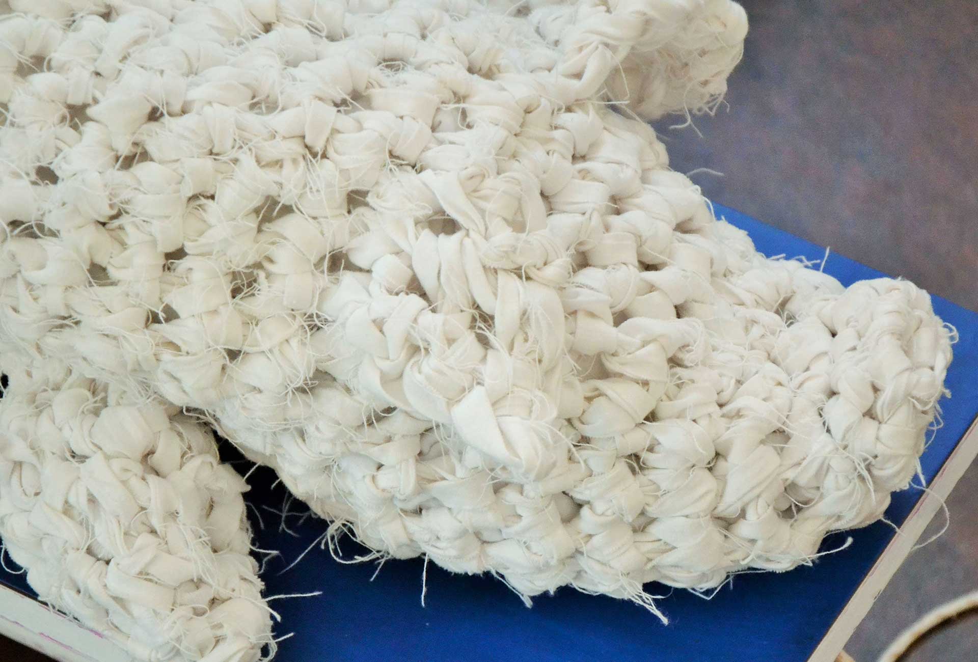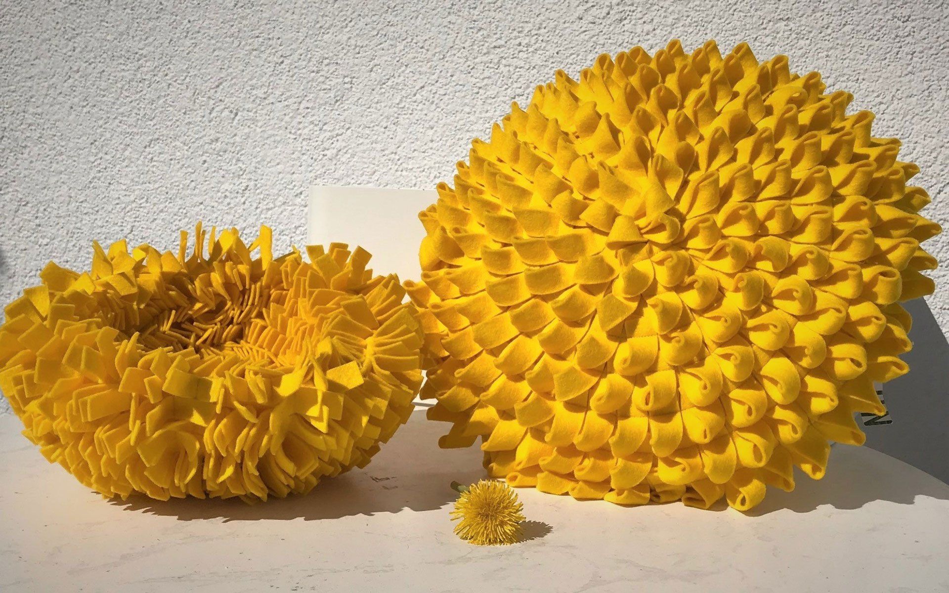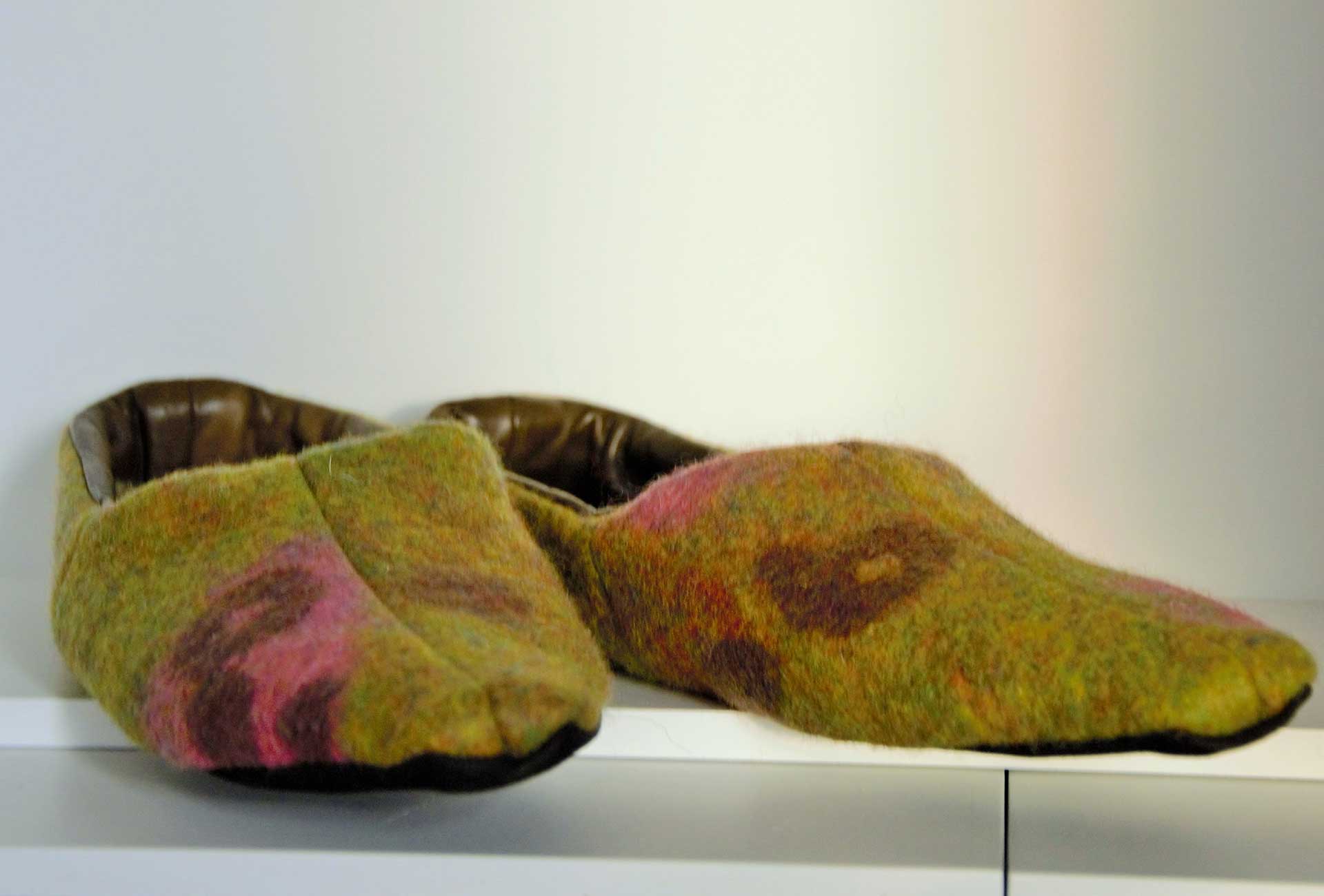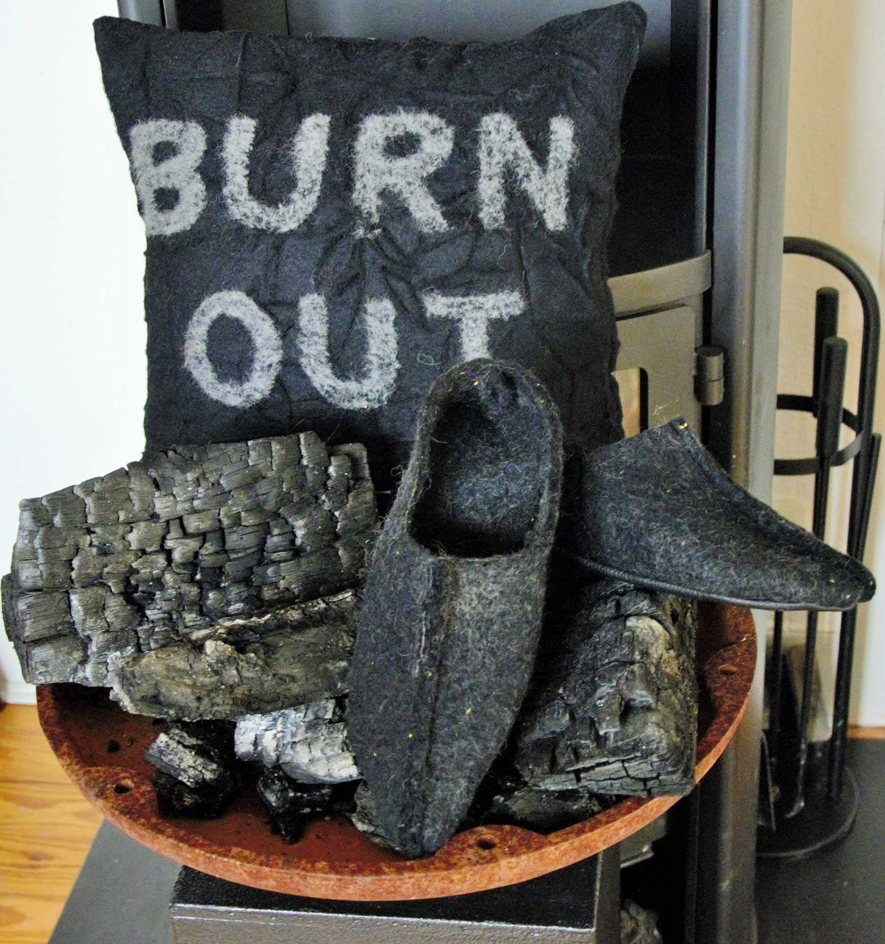 Objekt "Burnout" - handgefilzte Pantoffles und Kissen Nadelfilz